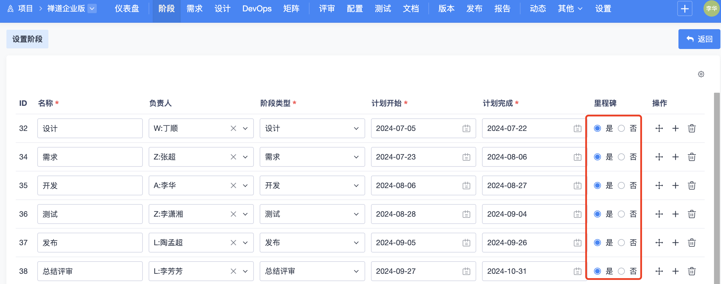 可以在项目--阶段--设置阶段页面中将某阶段设置为里程碑,就可以在里程碑报告中查看到对应阶段的里程碑报告。