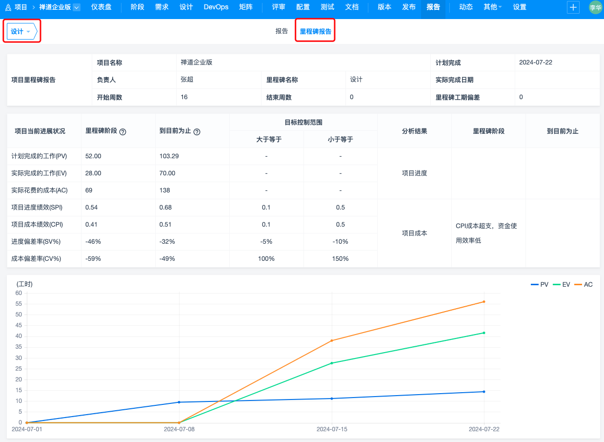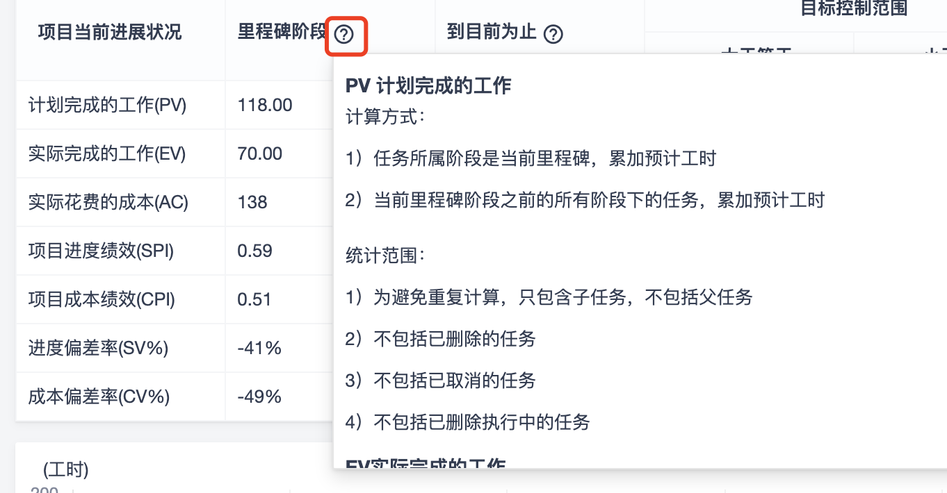 以里程碑报告为例,禅道里的挣值主要以工时为单位进行的度量,鼠标悬浮到里程碑阶段右侧的“问号”上,页面会给出挣值计算的逻辑。