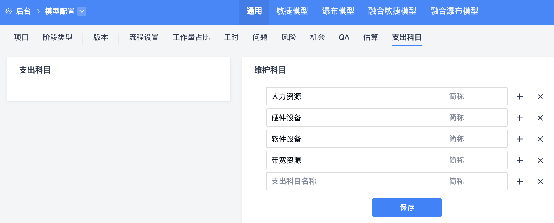 2.后台--模型配置--通用--支出科目中可以配置详细的支出科目。