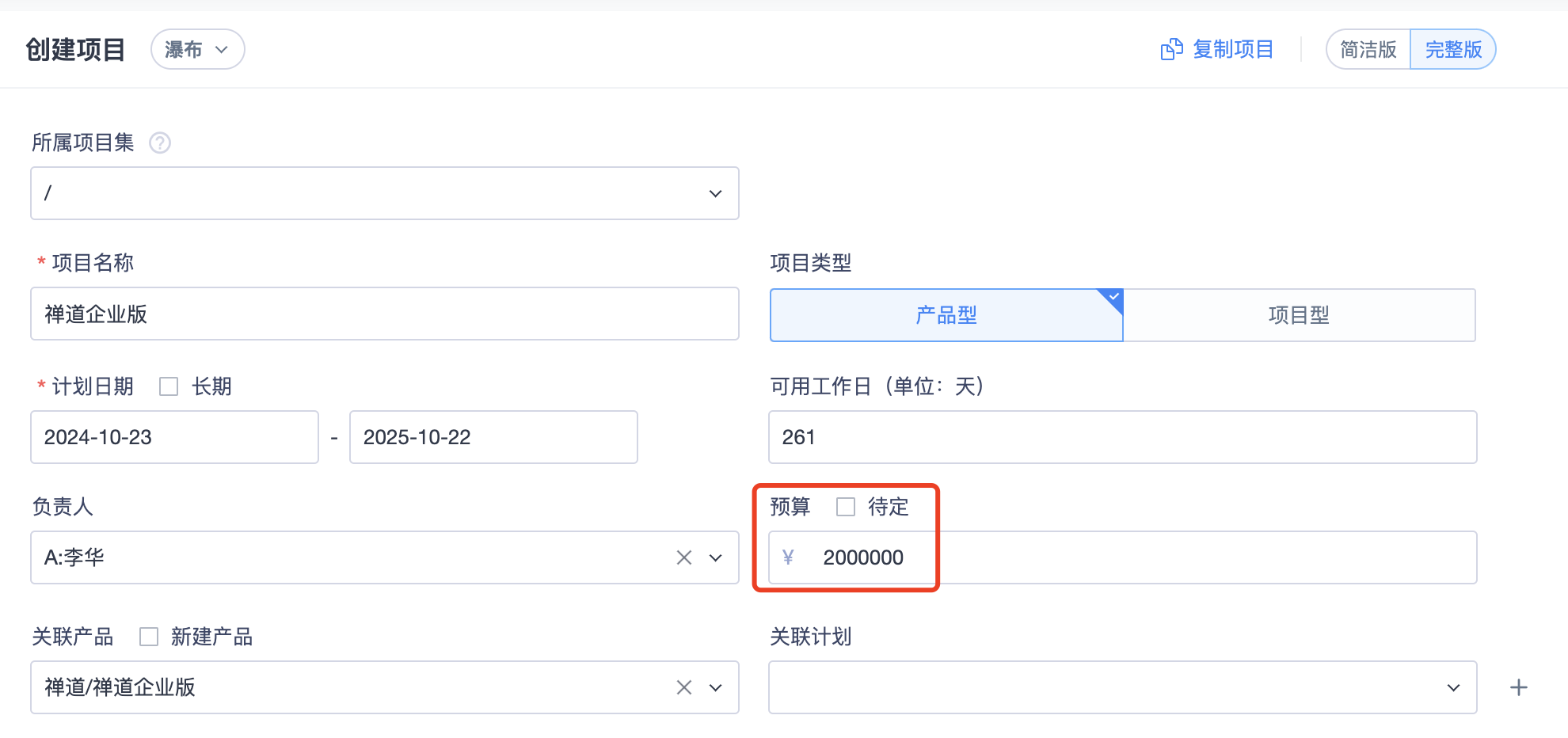 3.项目集和项目设置好预算,可以在创建和编辑时,设置预算金额。