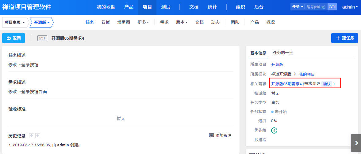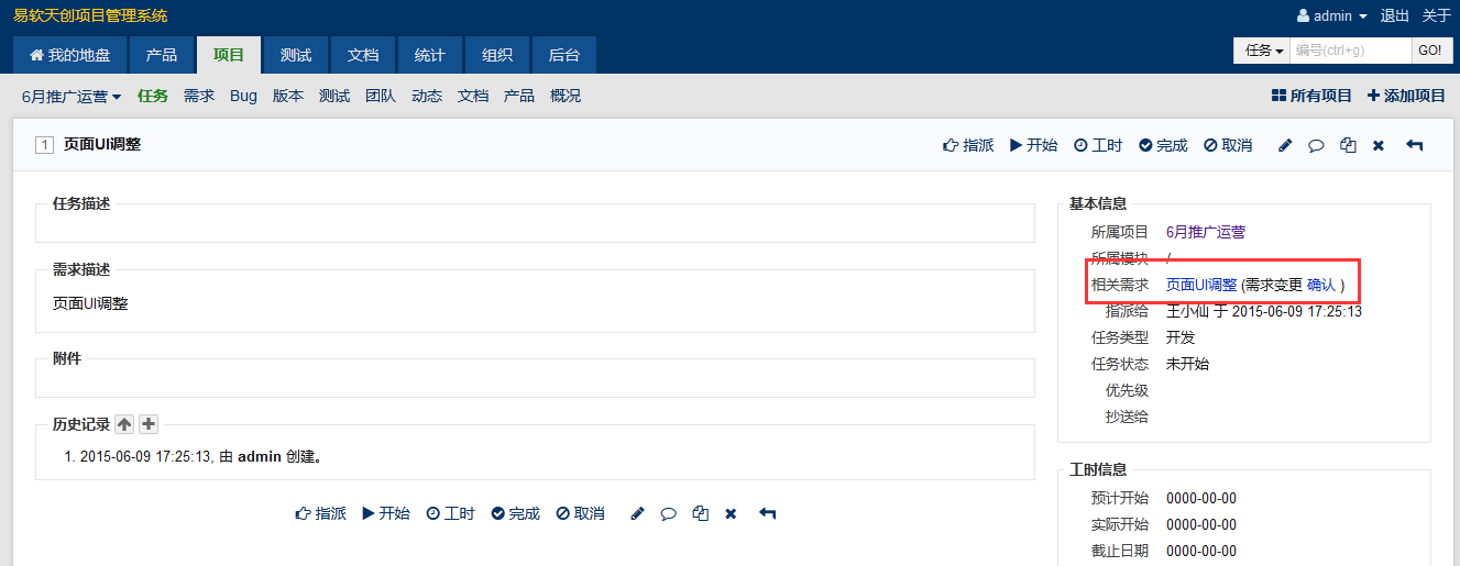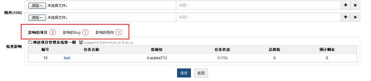 在需求中的影响范围里可以看到该变更的需求影响的项目任务、bug和用例,评审后,需要做相应的确认。