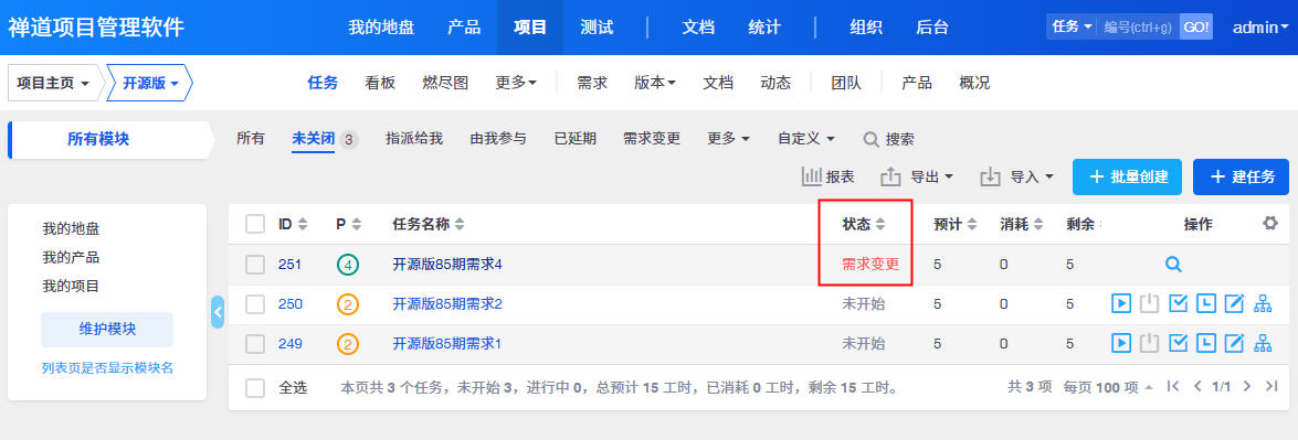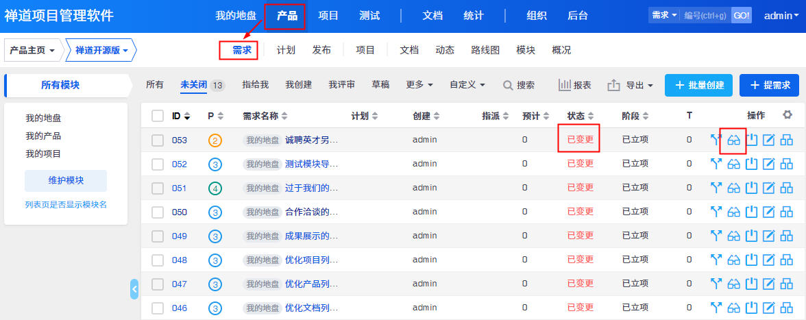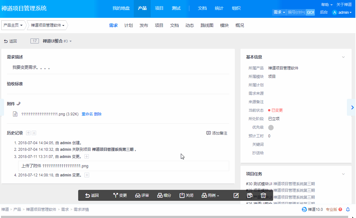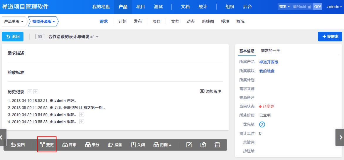 禅道专门提供了需求的变更流程。凡是对需求标题、描述、验证标准和附件的修改,都应该走变更流程。变更之后的需求状态为已变更。