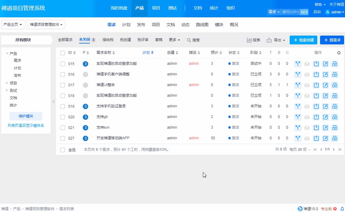 变更是需求管理必不可少的流程,禅道项目管理软件对需求的变更提供了全面的支持。其实需求的变更并不可怕,但不清楚影响范围的变更是很可怕的。在传统项目管理中,由于没有有力工具的支撑,产品经理在变更需求的时候,无法知晓该需求的影响范围,会有很大的随意性。禅道项目管理软件将需求、任务、bug和用例都纳入为一体管理,就可以很清楚的知晓变更的影响范围,从而给产品经理更好的指导。
