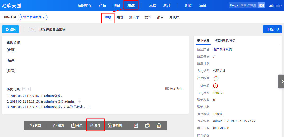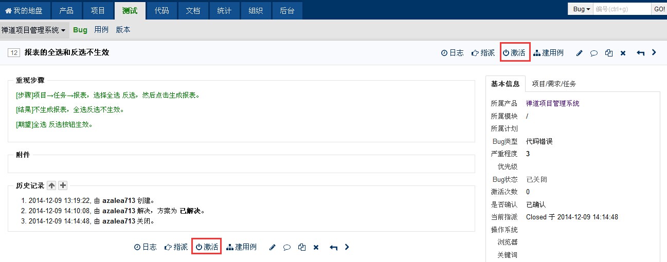 如果开发人员解决bug之后,验证无法通过,则可以将bug重新激活,交由后的解决者去重新解决。还有一种情况就是bug关闭之后,过了一段时间,bug又重现了,也需要重新激活。