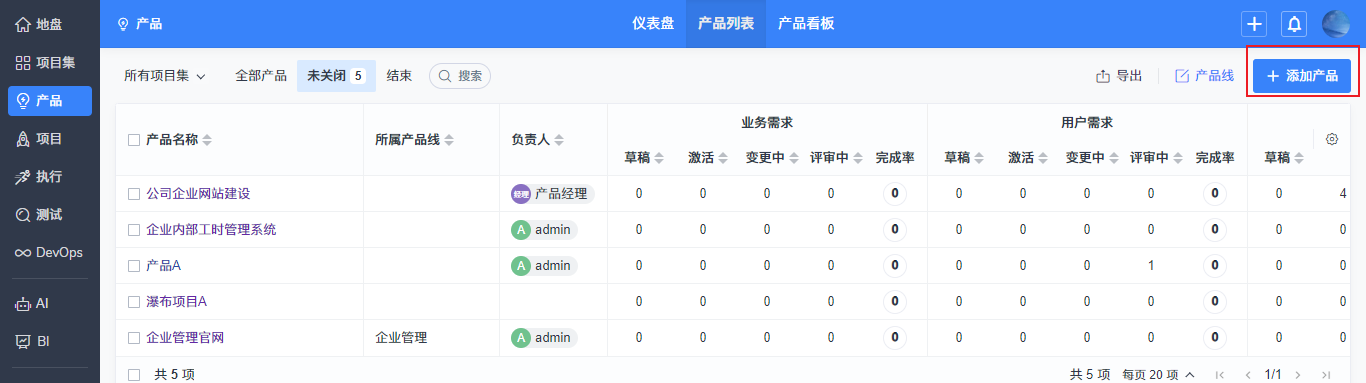 在“产品”-“产品列表”页面,可以查看所有有权限访问的产品,也可以按项目查看产品。还可以添加产品、编辑产品线或者导出产品列表。