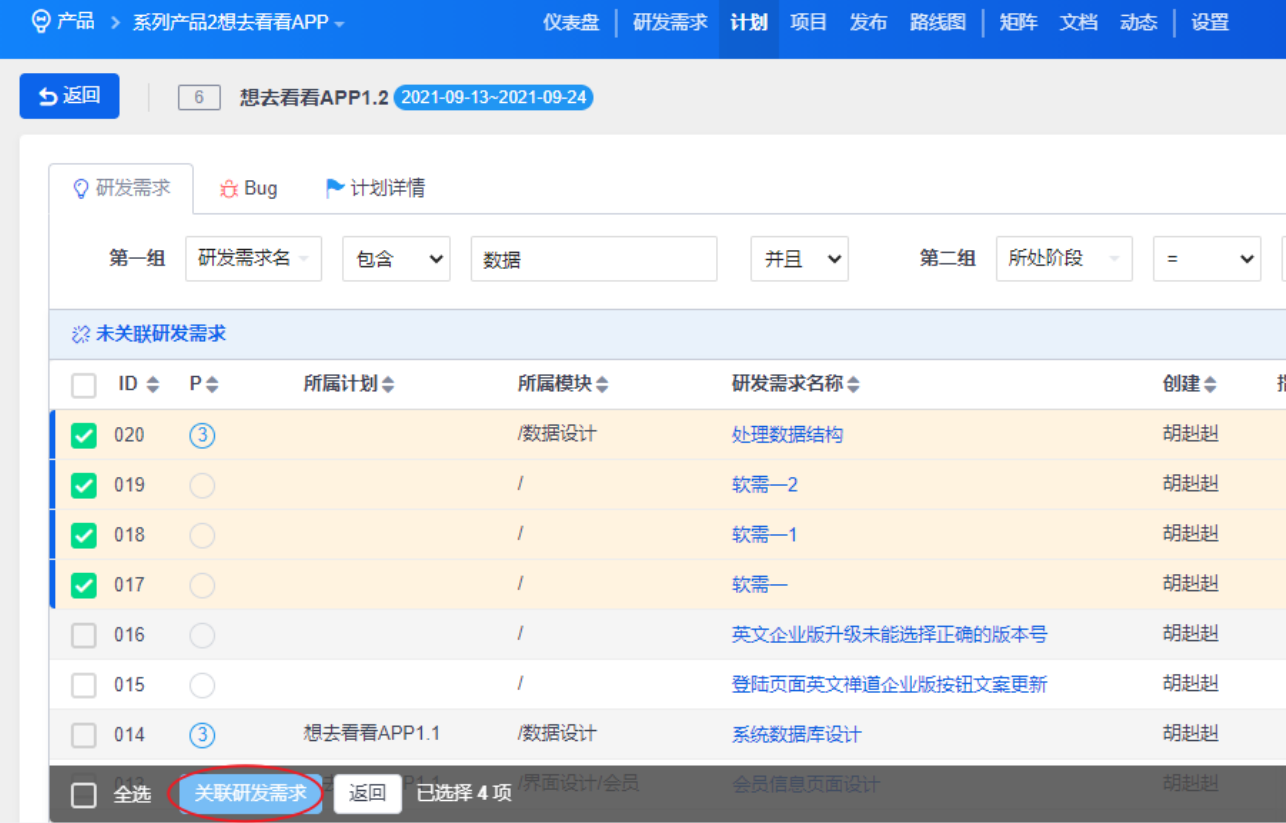 除了在创建需求时可以关联计划,在计划页面下,还可以进行批量关联。选择要关联的计划,点击“关联研发需求”。
