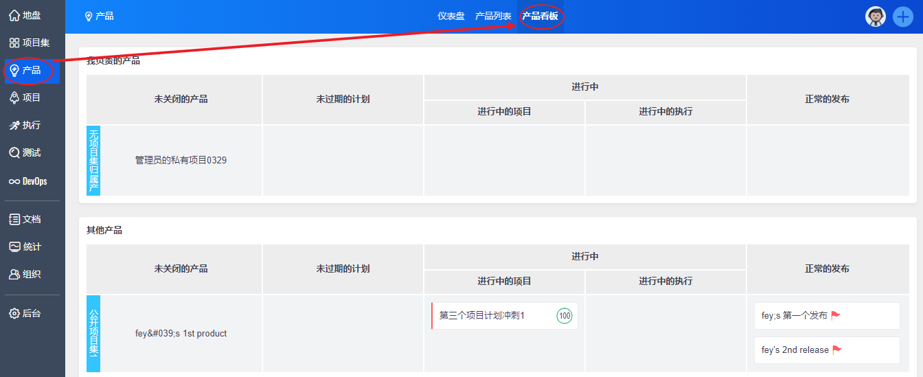 产品负责人可以通过产品看板了解产品的计划、进度、发布以及相关的项目和执行。