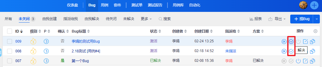 解决Bug成功后,Bug状态由激活修改为已解决。