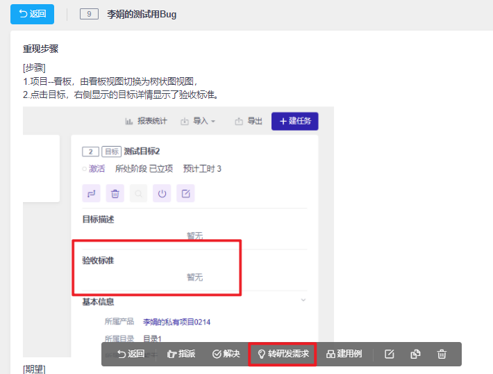 Bug详情页面有转需求按钮,可以直接将Bug转为需求。
