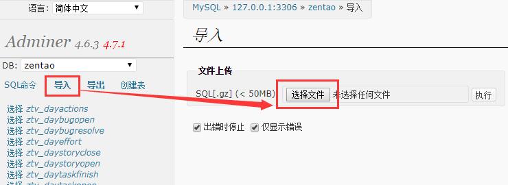 导入数据库:/opt/zbox/bin/mysql -u root -P MySQL端口 -p 要导入的库名 < XXXX.sql (如:/opt/zbox/bin/mysql -u root -P 3306 -p zentao < zentao.sql)