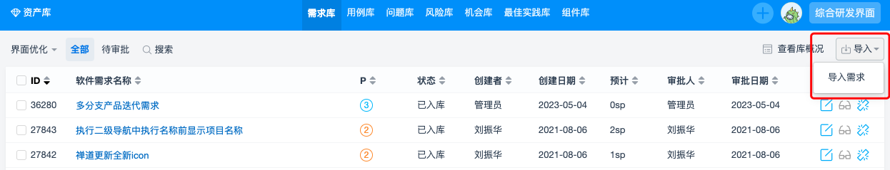 在项目需求的列表页可以批量把项目需求导入到需求库。
