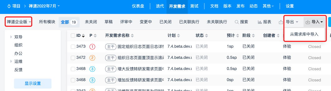 项目需求可以从需求库里导入,左侧项目关联产品下拉组件中,选择具体一个产品,然后点击导入--从需求库中导入。
