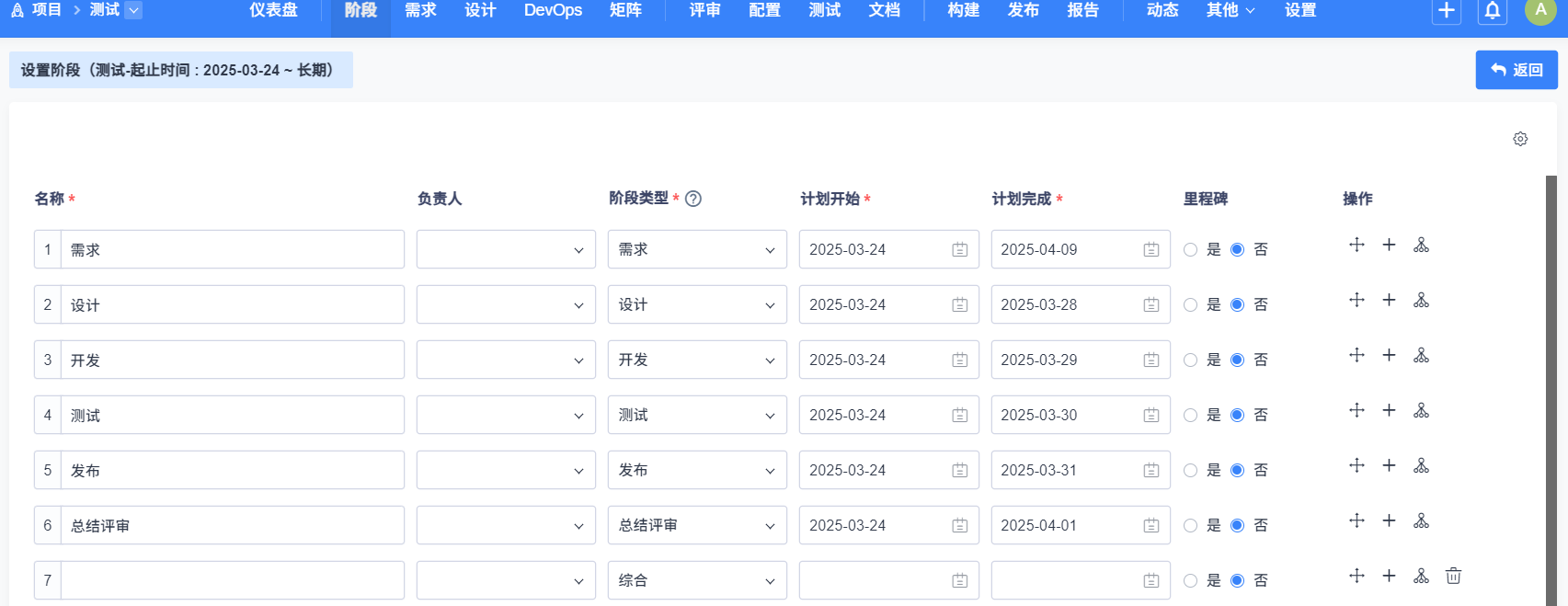 我们默认的阶段类型有综合、需求、设计、开发、测试、发布、总结评审和其他。