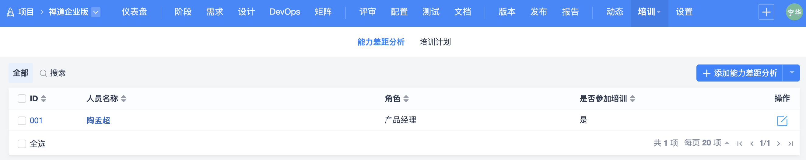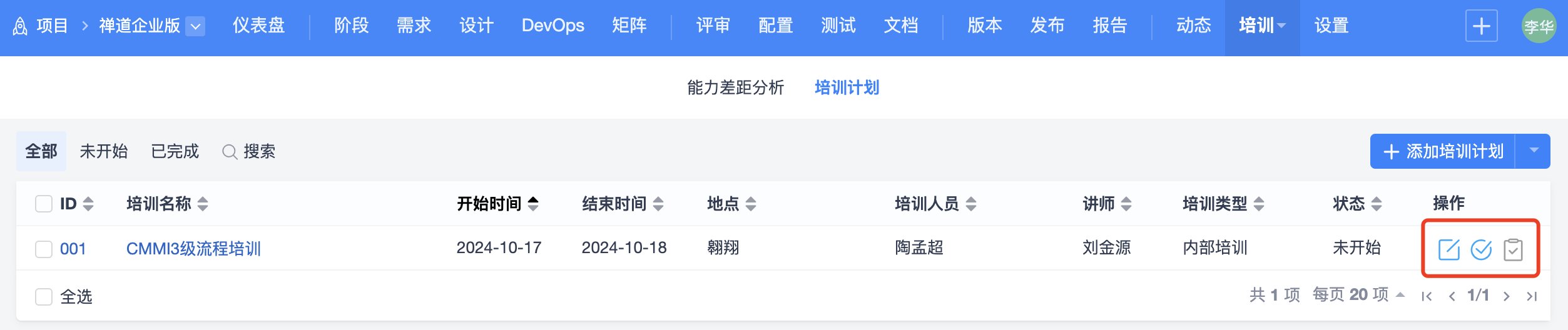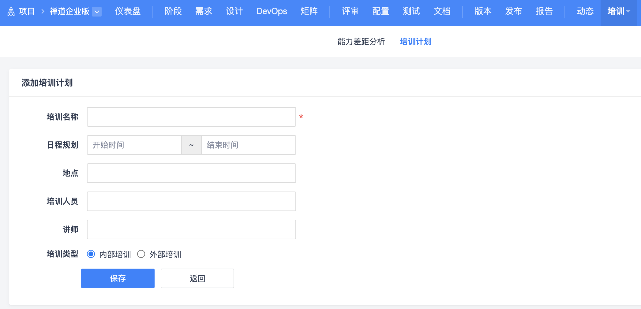 通过培训功能,可以针对项目开发需求进行能力差距分析,制定项目培训计划,填写培训总结。