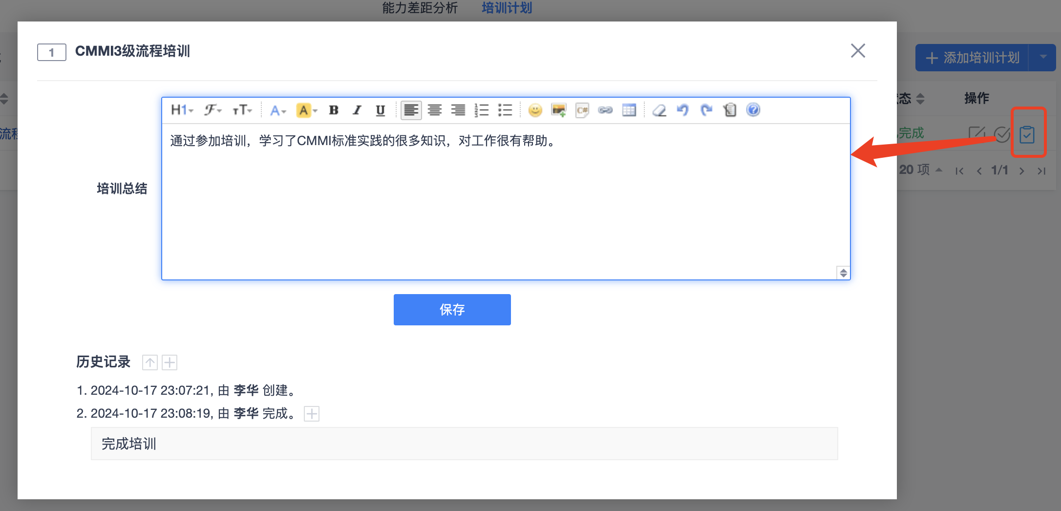 在培训完成后,可与点击“培训总结”按钮,填写培训总结。