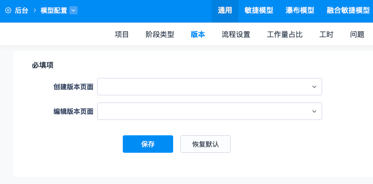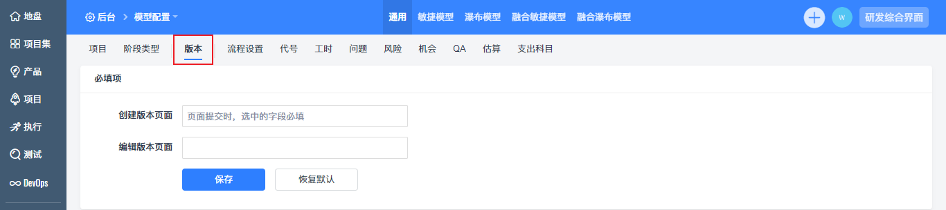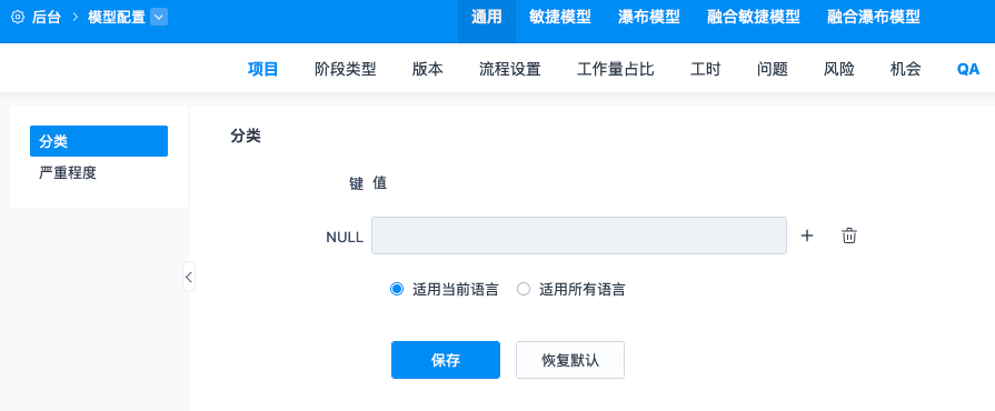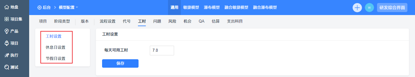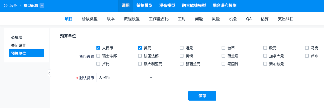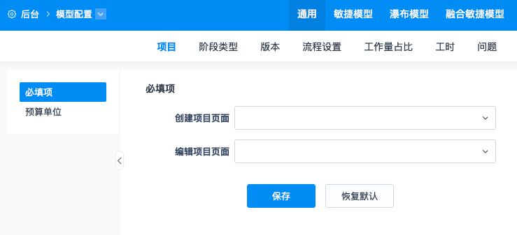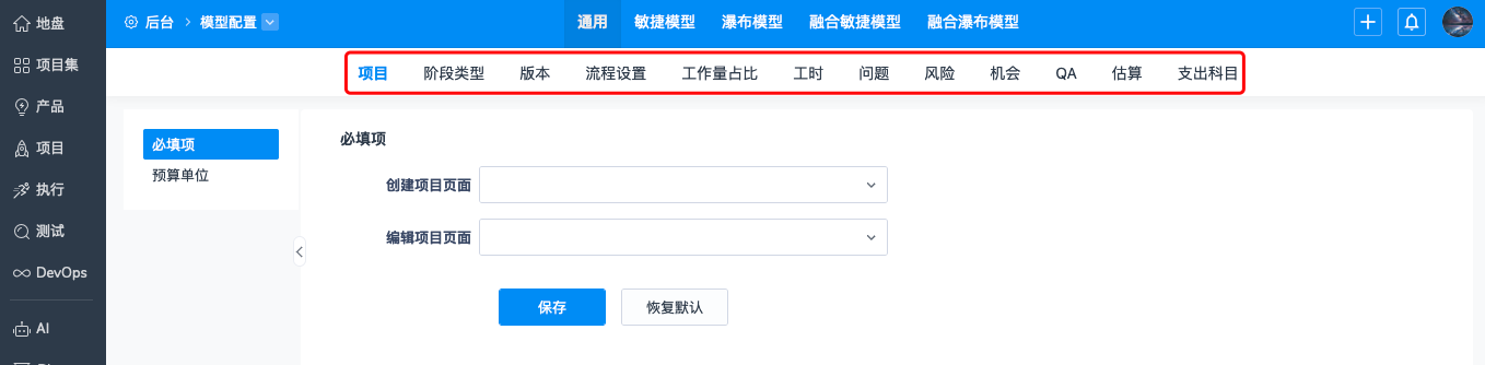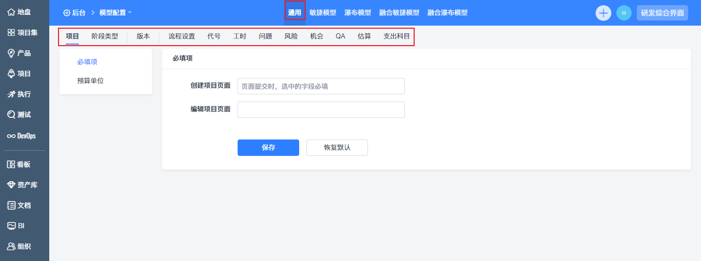 在“后台”-“模型配置”-“通用”中配置项目通用要素的配置项,比如项目、阶段类型、版本、流程设置、工作量占比、工时、问题、风险、机会、QA、估算、支出科目等。