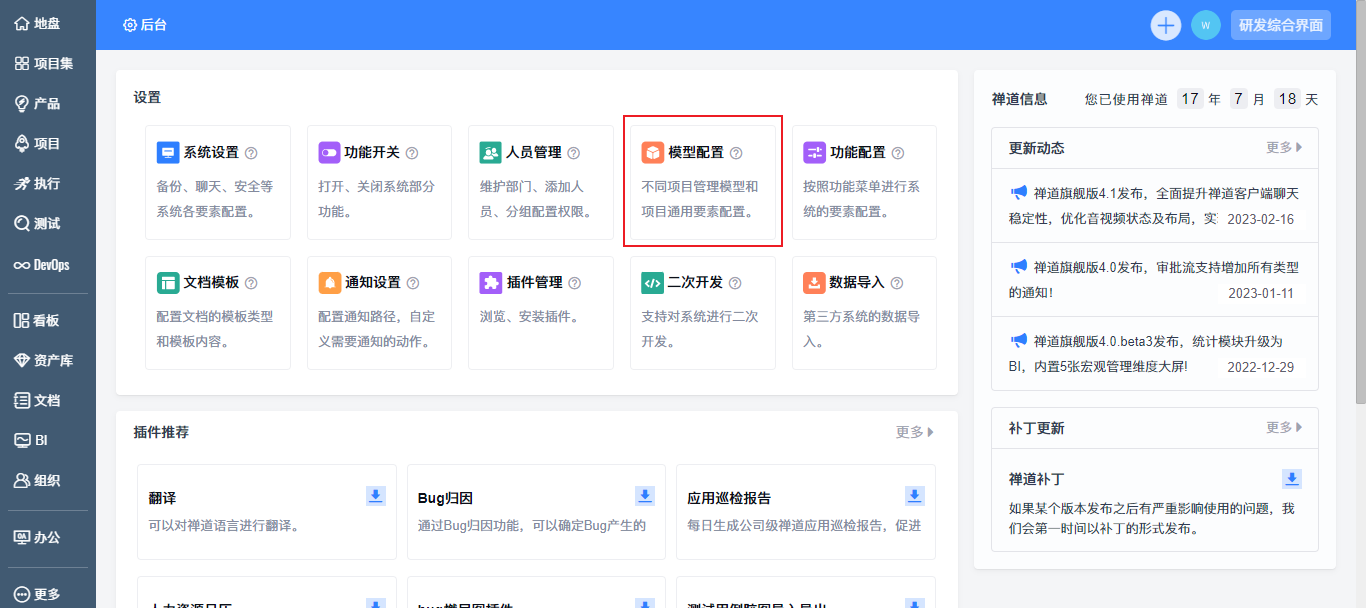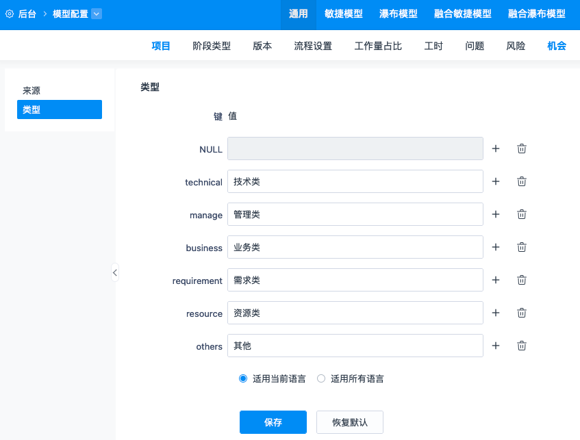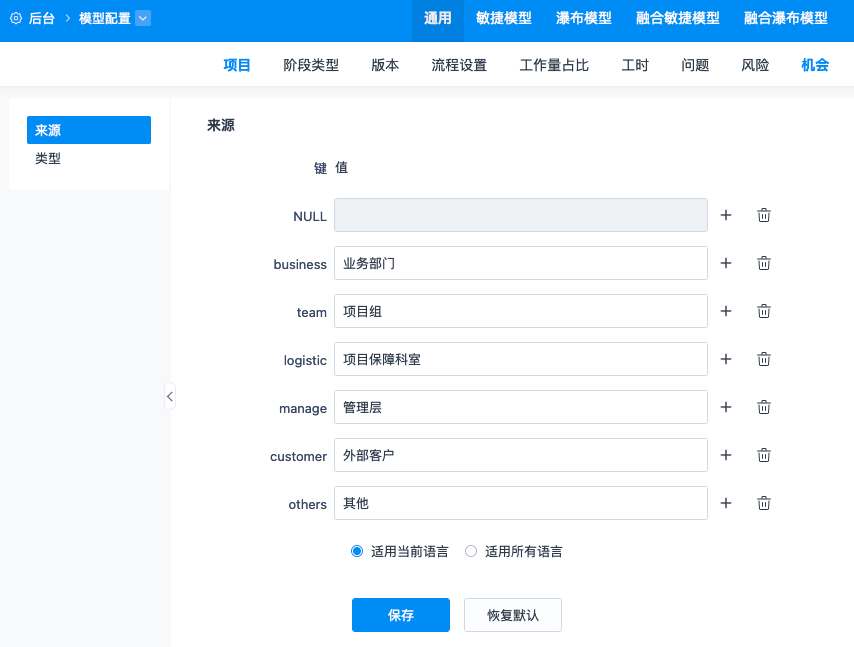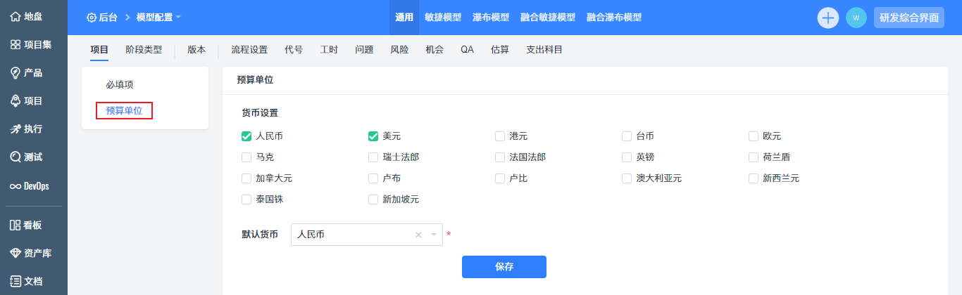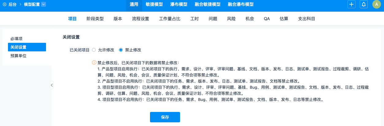 在“后台”-“模型配置”-“通用”中配置项目通用要素的配置项,比如项目、阶段类型、版本、流程设置、工作量占比、工时、问题、风险、机会、QA、估算、支出科目等。