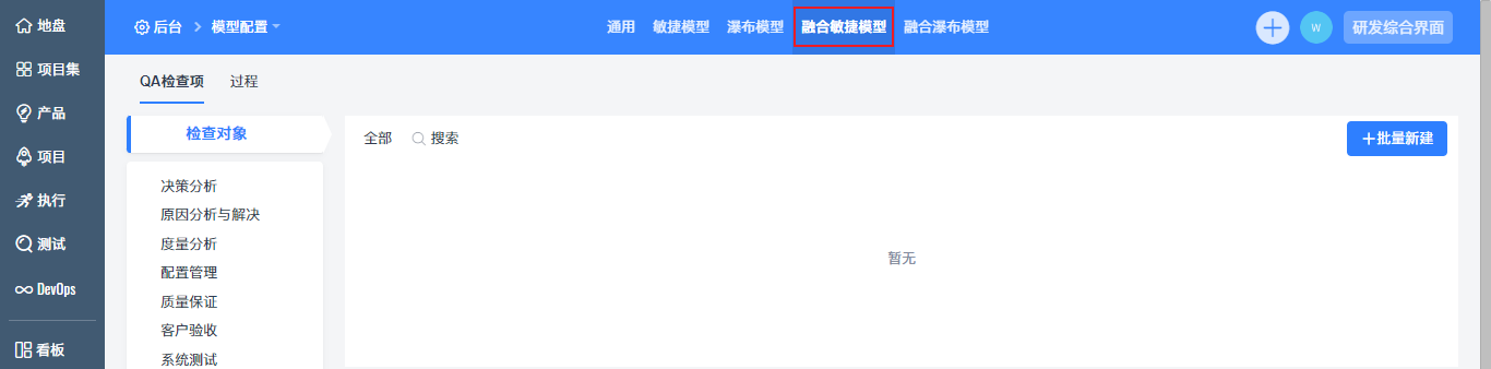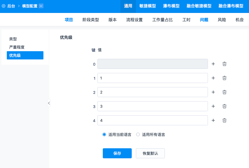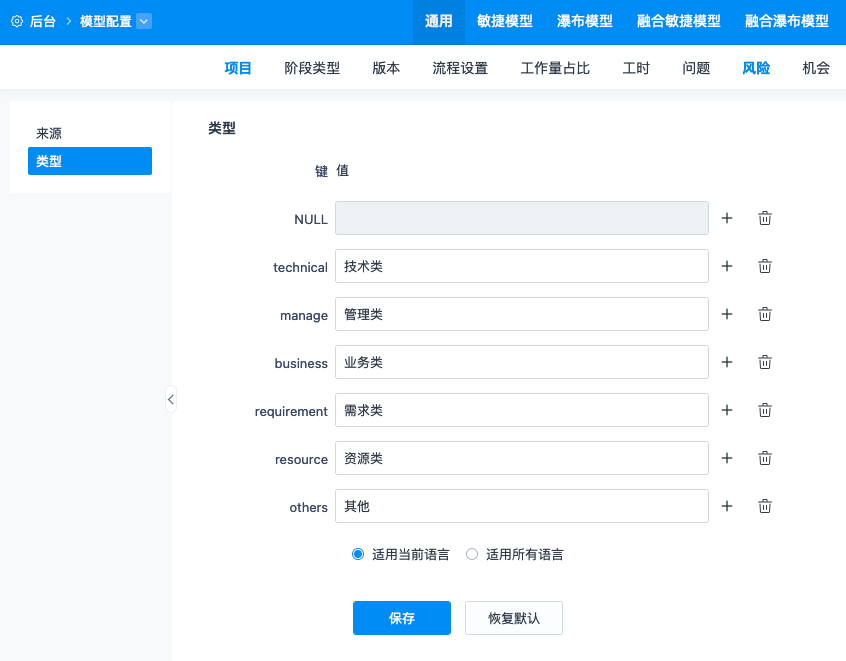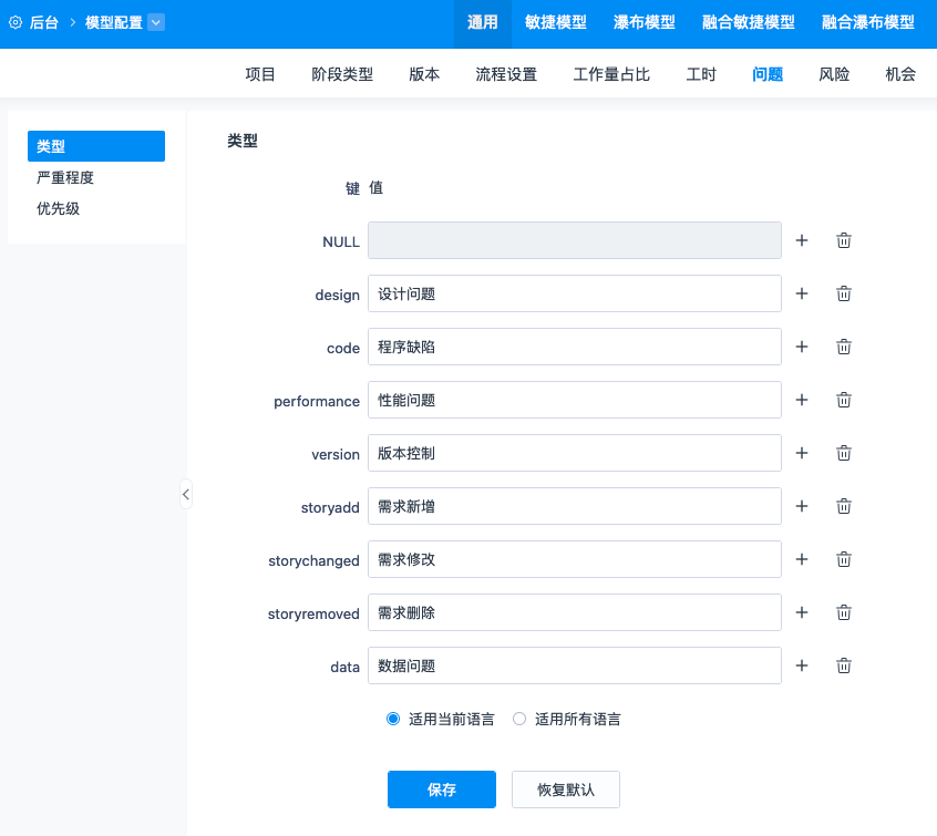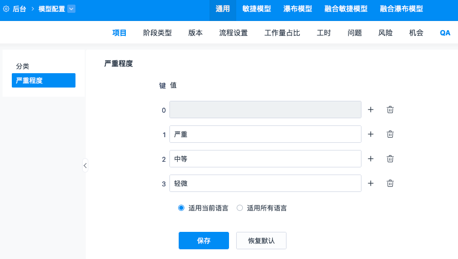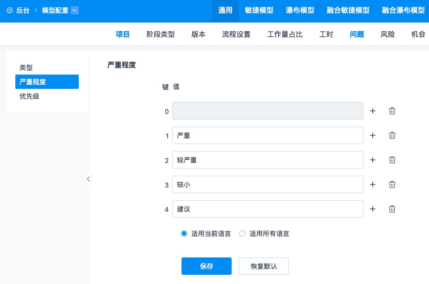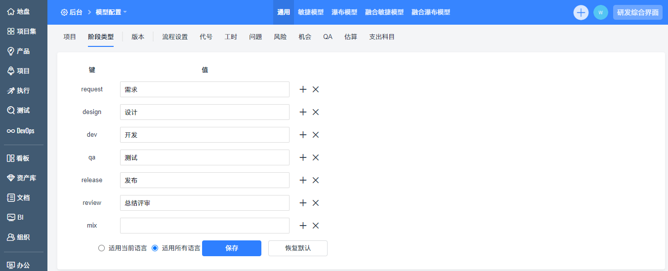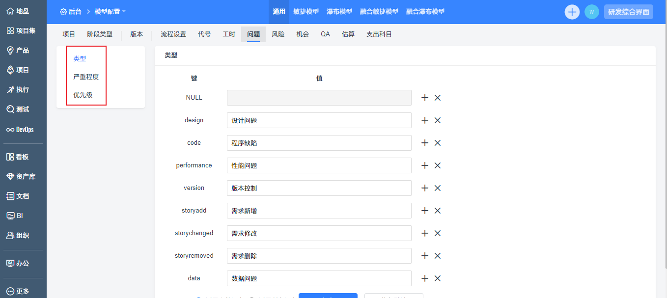 项目相关的要素定义均可在模型配置中完成,其中通用的项目要素在“模型配置”-“通用”中定义,各模型特有的要素分别在“敏捷模型”、“瀑布模型”、“融合敏捷模型”、“融合瀑布模型”中定义。
