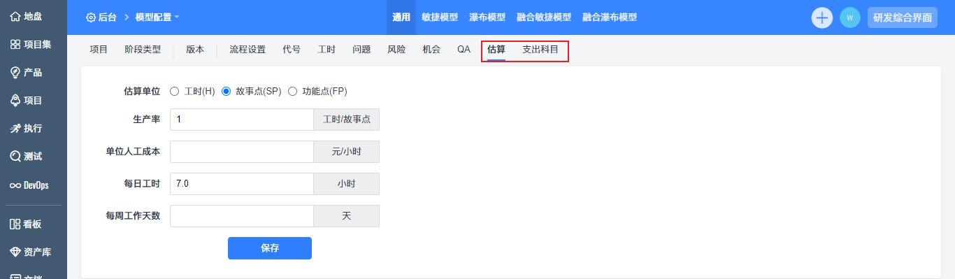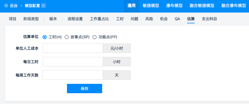 在通用-估算设置中,可以自定义估算单位、单位人工成本、每日工时、每周工作天数。