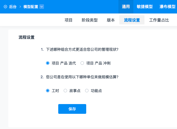 在通用-流程设置中设置项目、产品、迭代的管理方式和规模估算单位。