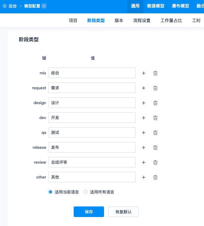 在通用-阶段类型中可以设置瀑布项目默认的阶段类型。