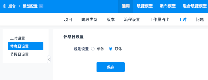 在通用-工时设置中可以进行休息日设置,可以设置单休或双休。