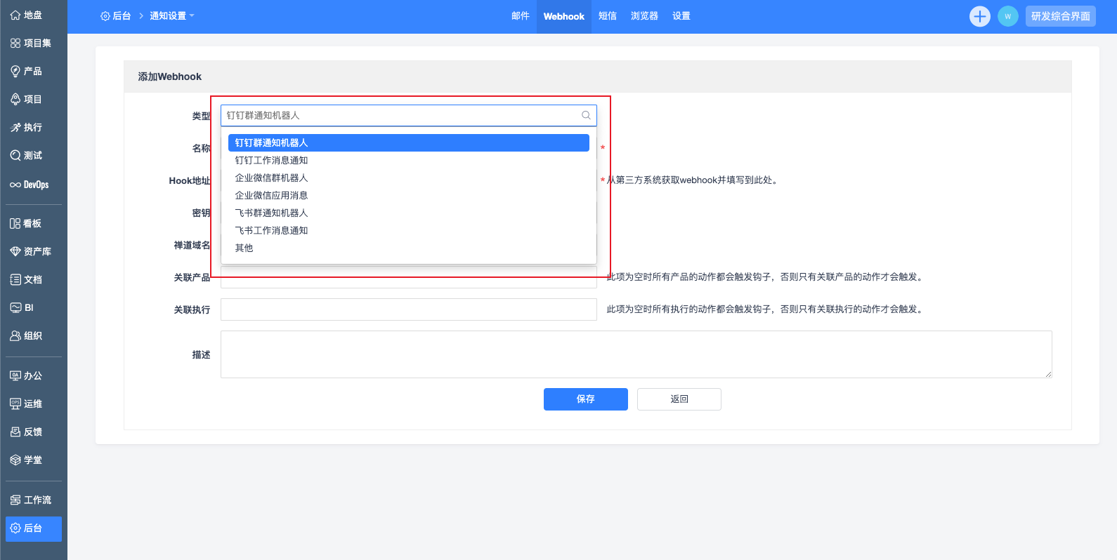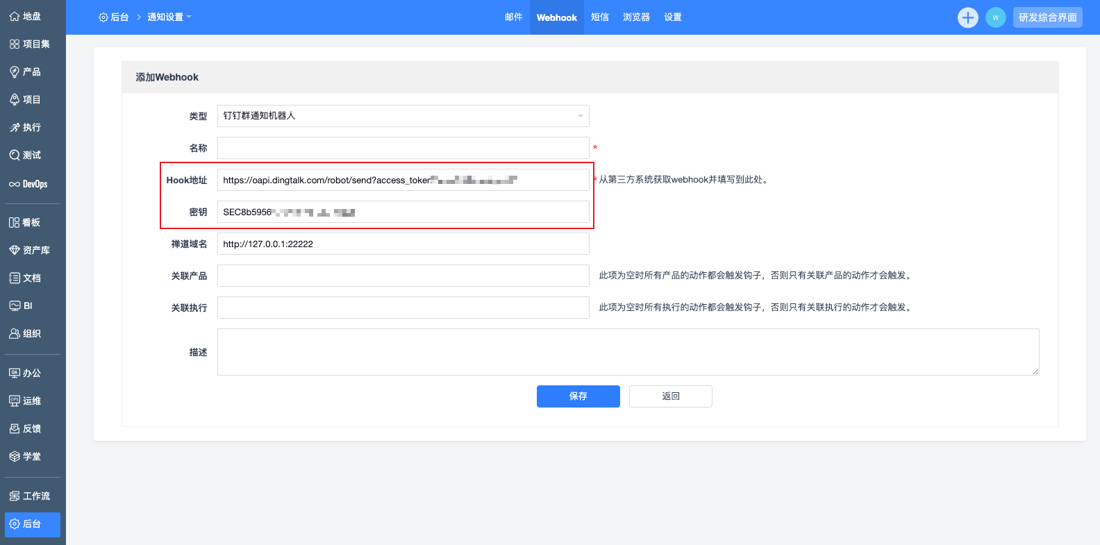 - 关联产品:空意味着对禅道内的所有操作都会发送给 hook 地址,否则只发送所选择的产品相关的操作。
