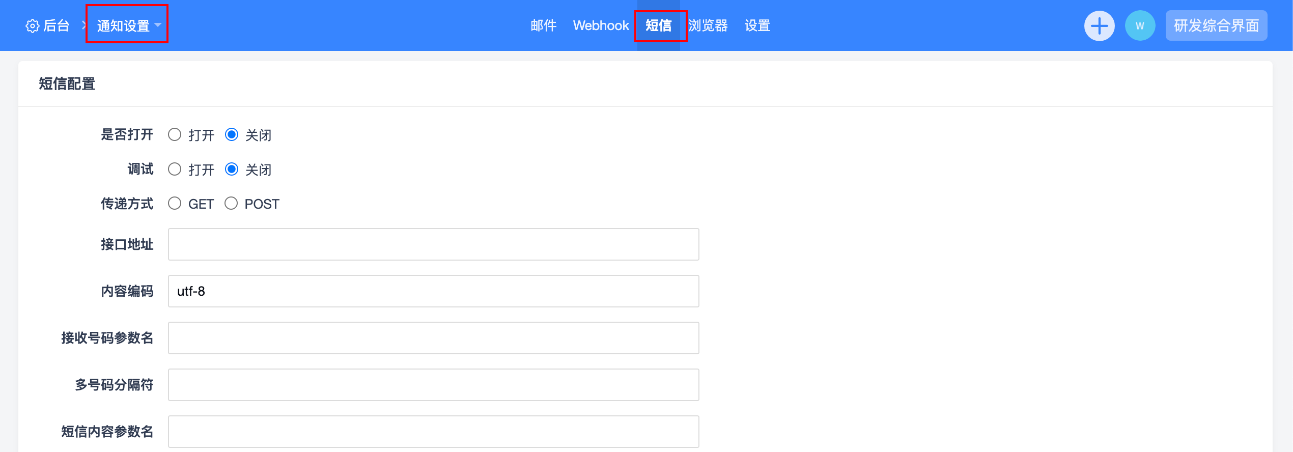 注:目前短信仅支持短信网关的短信发送,暂时不支持阿里、腾讯等短信开放平台的接入。