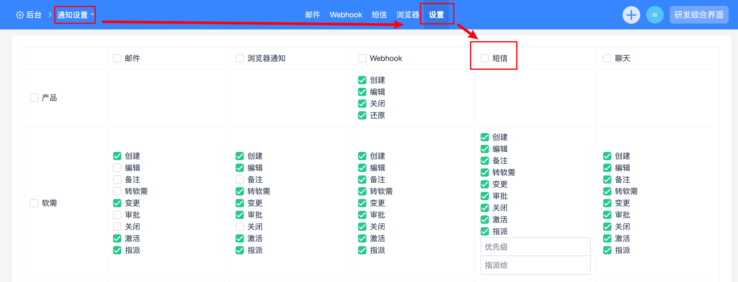在“通知设置”-“设置”下,可以设置触发禅道发送短信提醒的动作。
