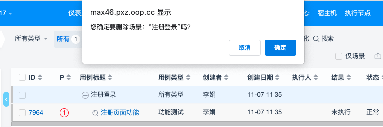 在用例的列表页面中,可在右侧操作列点击【删除】按钮删除场景,被删除的场景可在后台-系统-回收站中恢复。