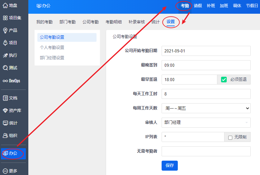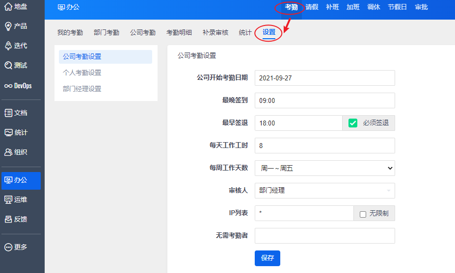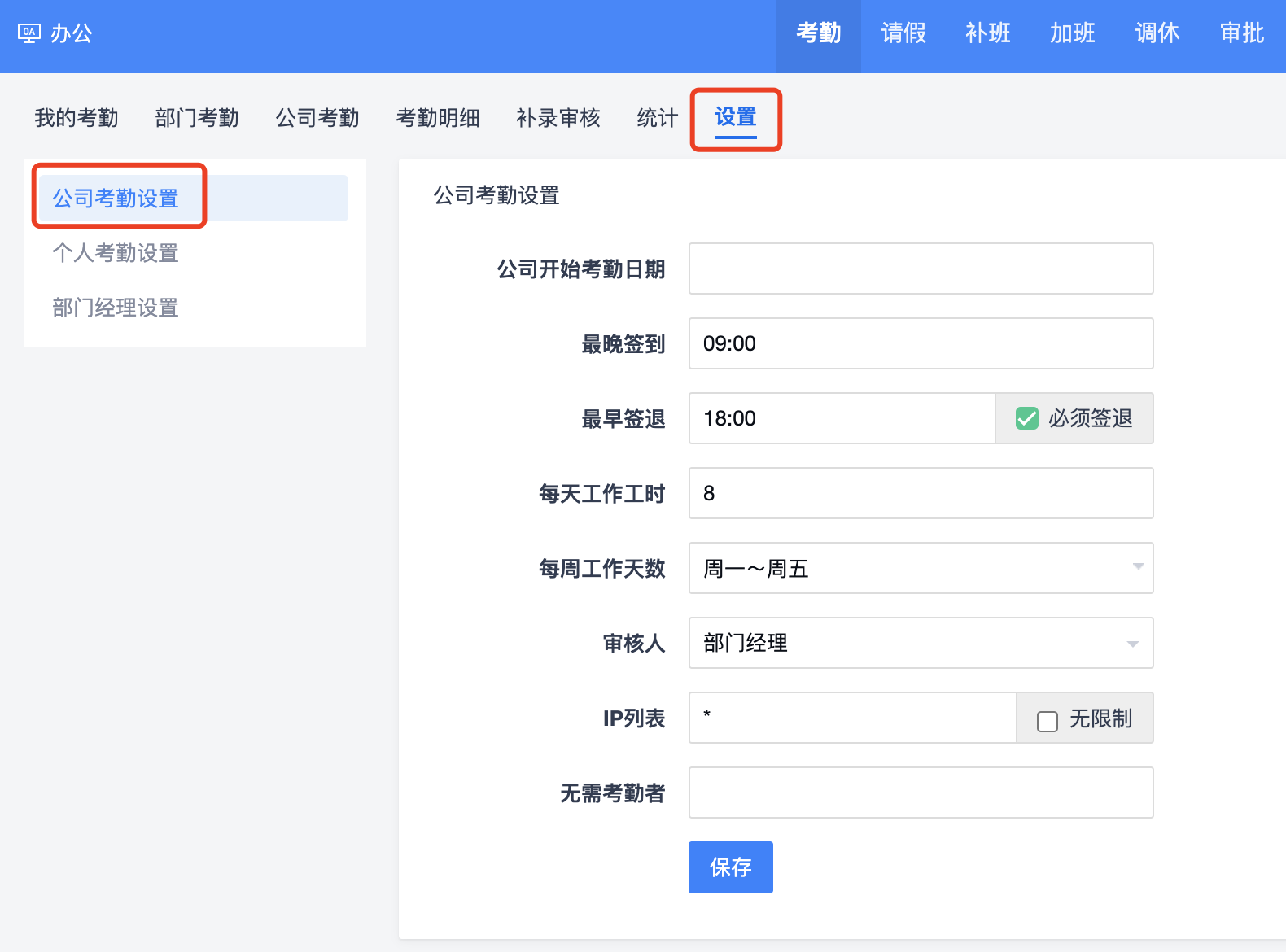 在“办公”-“考勤”-“设置”里做“公司考勤设置”、“个人考勤设置”和“部门经理设置”。