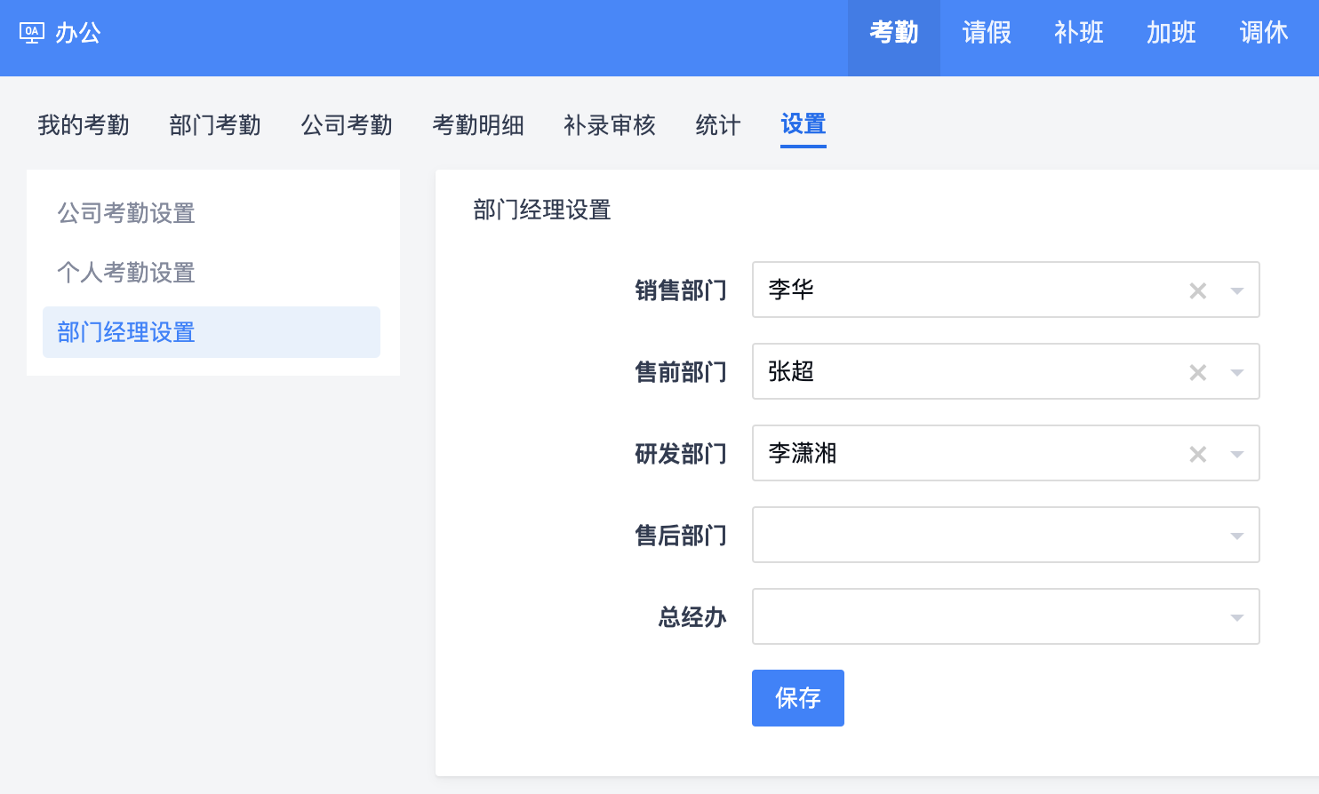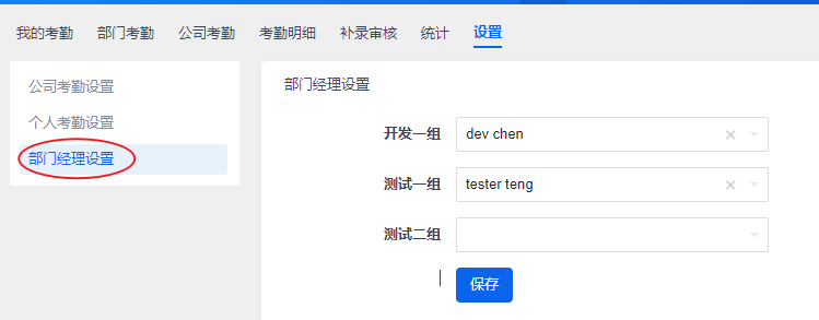 考勤设置里,如果设置部门经理为审核人,在这里编辑部门设置负责人。部门负责人即是部门经理。