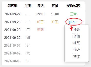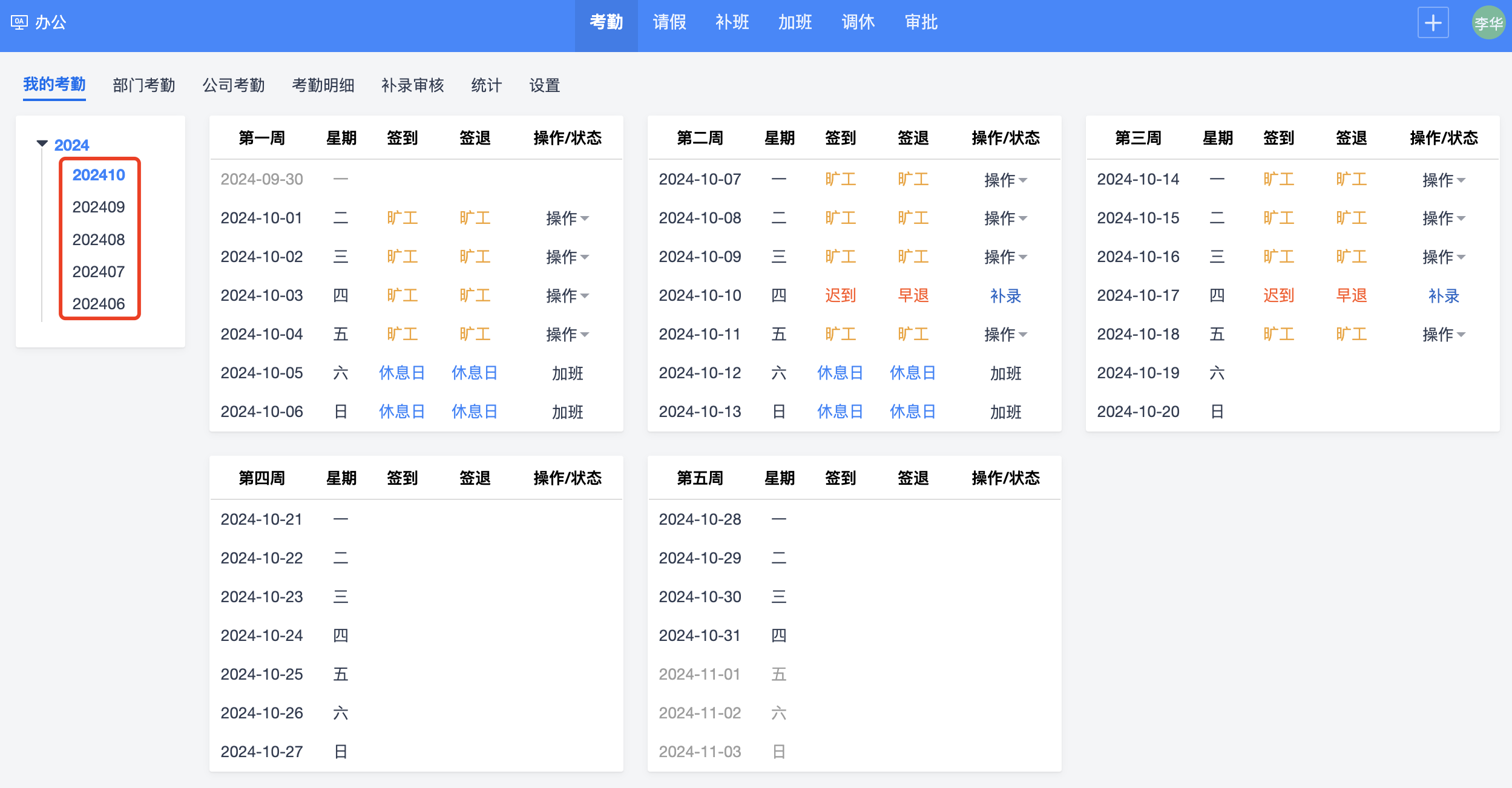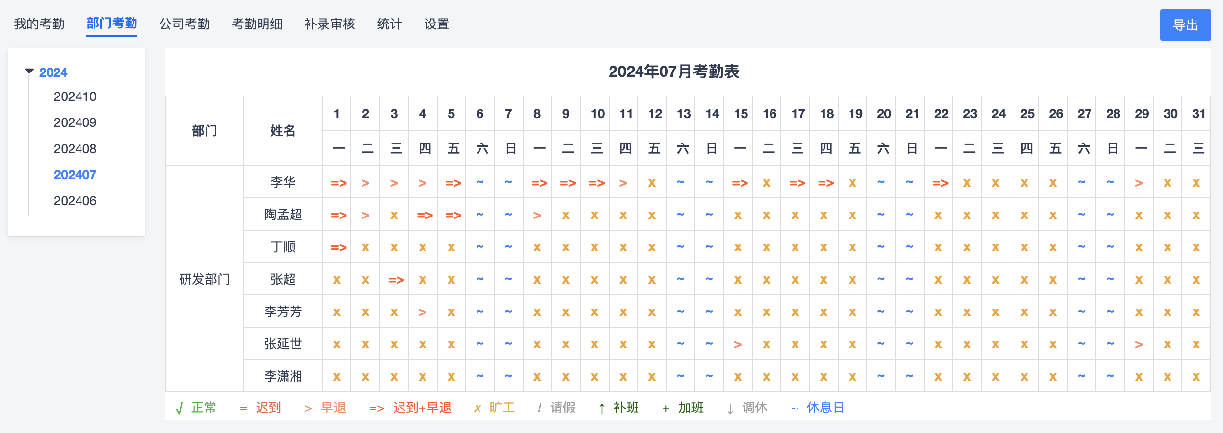 作为部门负责人,可以查看到部门下面每个人员的考勤情况。