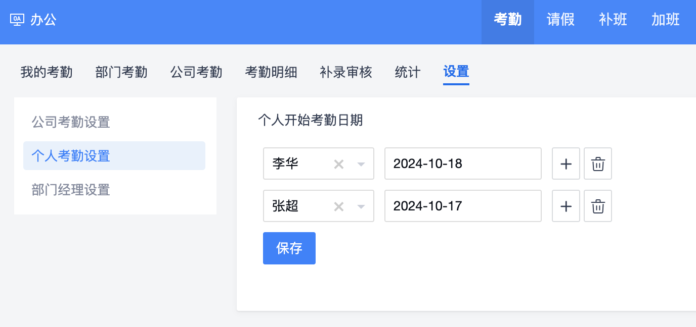 可以设置某个用户开始考勤的日期,适用于新员工的考勤。