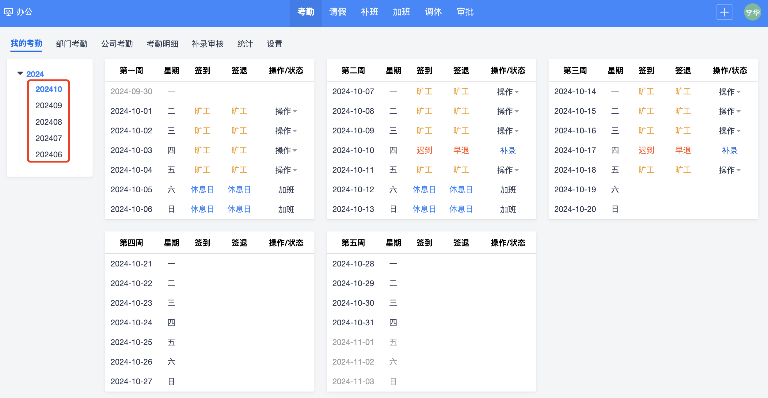 办公模块下有考勤、请假、补班、加班、调休、节假日和审批功能。