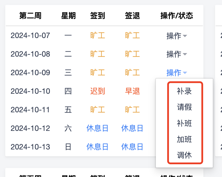可以设置考勤日期、上下班时间、每周工作天数,以及设置是否需要签退。