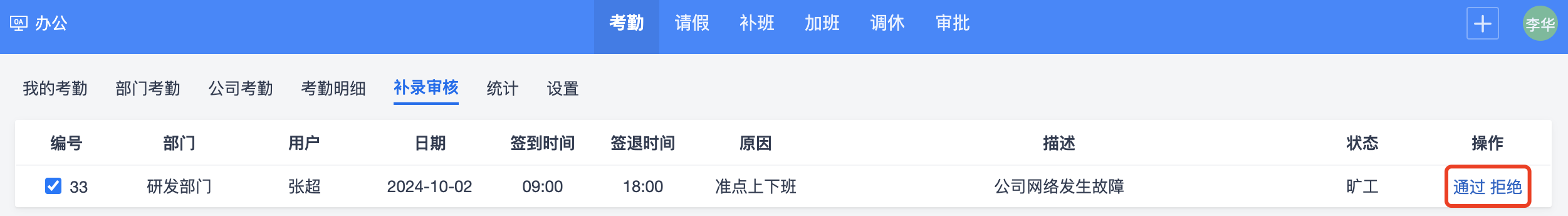 作为部门负责人,可以对部门人员提交的补录考勤进行审批。