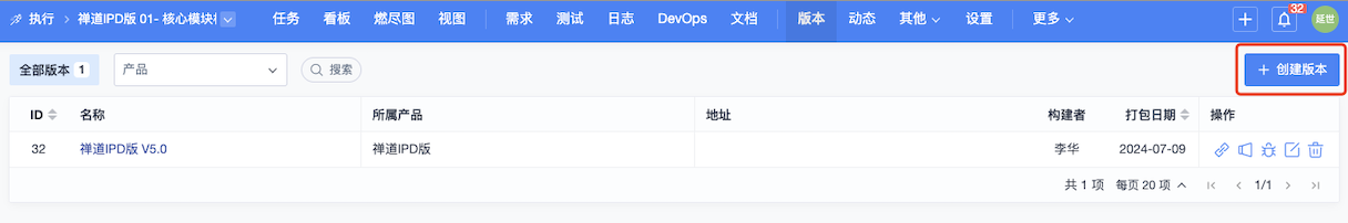 创建构建时,如果该项目/执行只关联了1个产品,直接列出产品名称。如果该项目/执行关联多个产品或者是一个产品的多个分支,可以在下拉列表里切换。