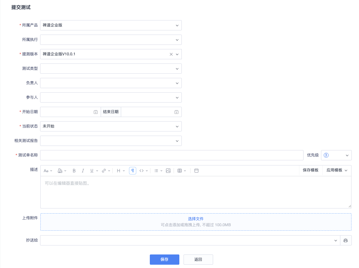 点击构建列表右侧的提交测试操作按钮,跳转到创建测试单页面。