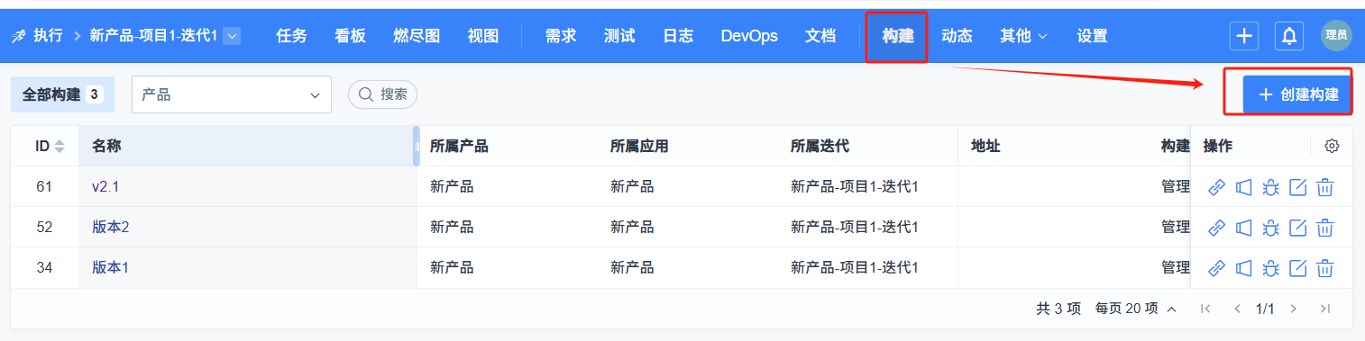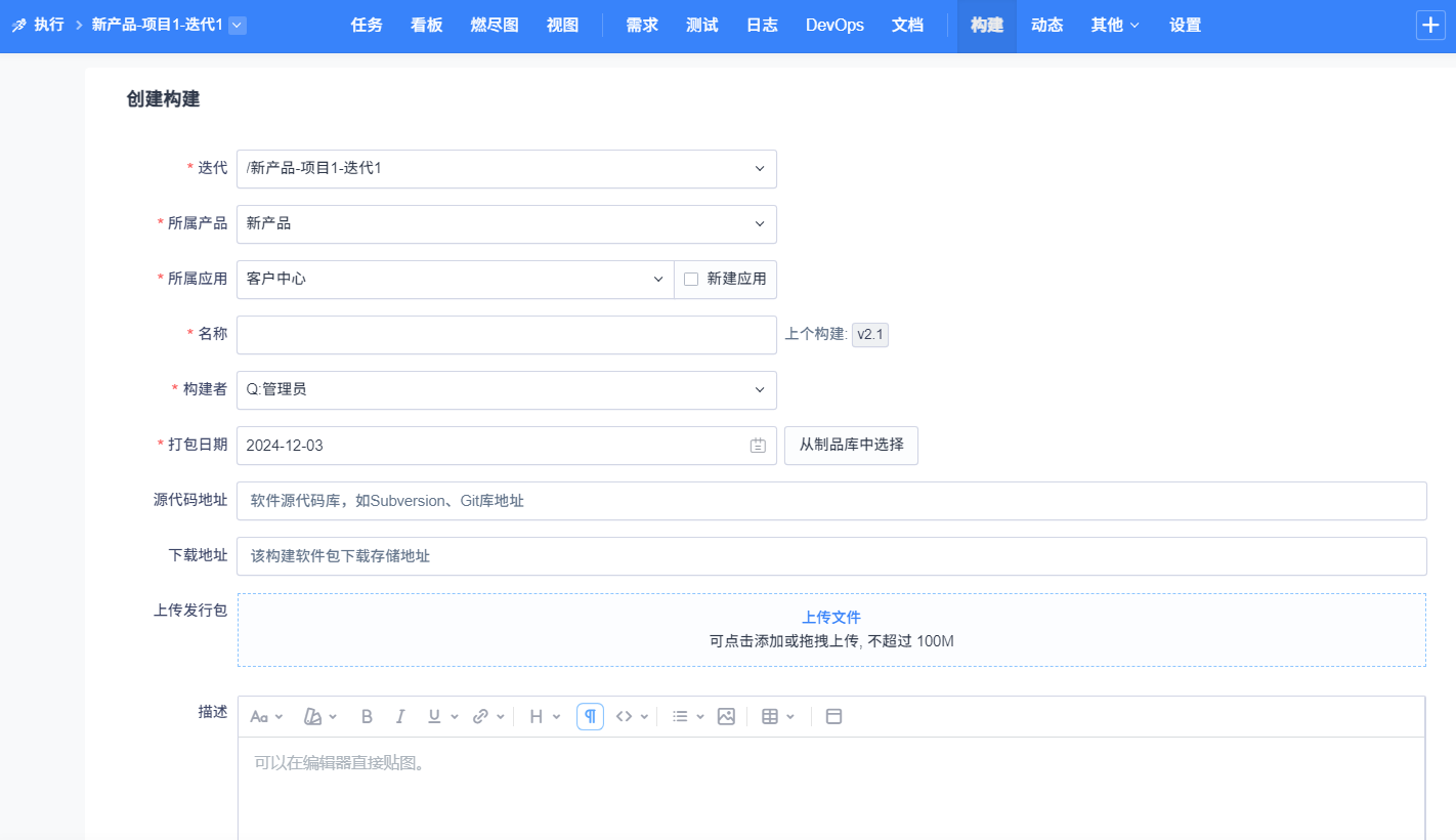 项目/执行的负责人或发布负责人可以在项目/执行--构建里创建构建。