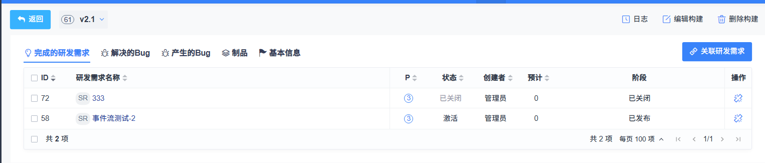 构建创建成功后,可以通过关联操作按钮关联需求和Bug。构建下关联的需求和Bug就是给测试人员圈定了测试范围。