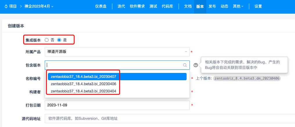 如果选择了集成构建,则包含构建中可以关联迭代下的多个构建。