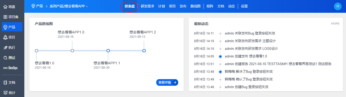 在产品模块下,仪表盘展示了禅道系统中所有产品的概况,包括,产品的研发需求、计划以及发布的数量。