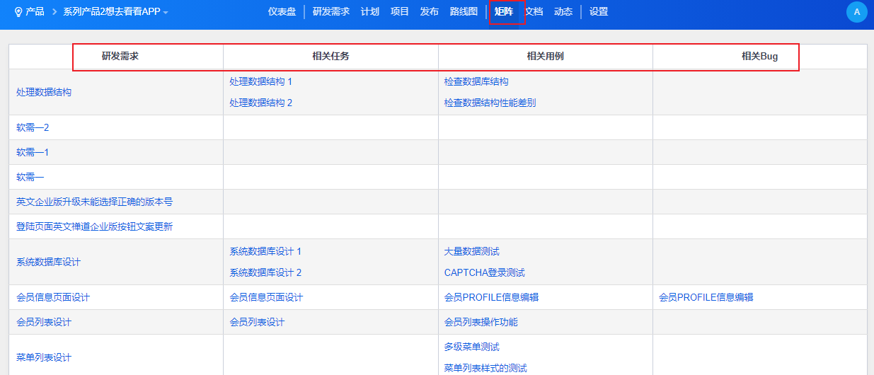 在“产品”-“矩阵”中,可以查看研发需求及其相关的任务、用例和Bug。