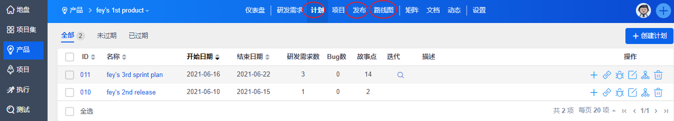 您还可以通过产品下的计划、发布和路线图查看产品的进度。