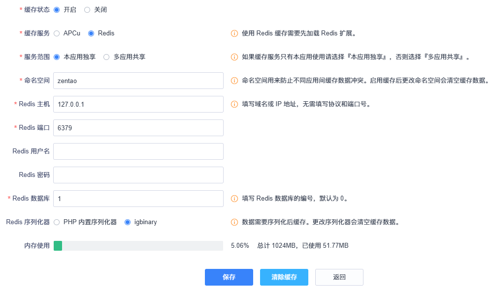 缓存作为基础设施可以同时提供给多个应用使用,如果该缓存服务只有禅道使用可以选择【本应用独享】,否则选择【多应用共享】。这两个选项的区别在于清除缓存时采用不同的机制,性能略有差异,使用方面没有差异。
