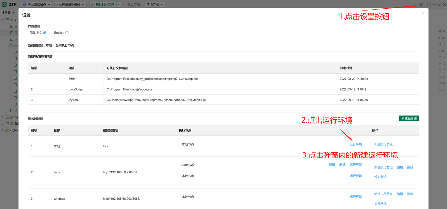 禅道官方镜像中默认安装了ZTF,ZTF支持自动化测试脚本的定义、管理、驱动、执行结果回传到禅道、创建禅道Bug以及和其他自动化测框架的集成,简单易用,语法简单。如果您使用ZTF,在客户端中点击“设置”,选择服务器(默认为本地)和执行节点(默认为本地)后点击“运行环境”。