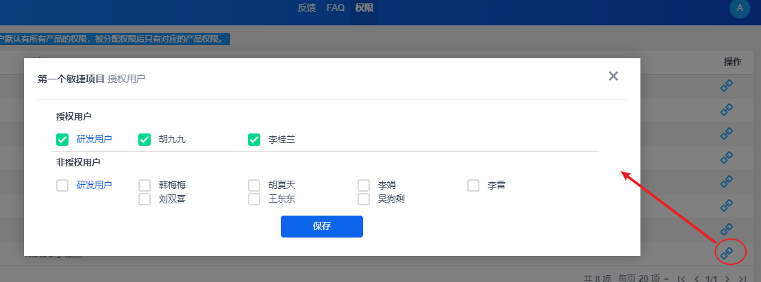 点击产品后面操作栏的“授权用户”按钮,进入权限分配页面,可以按需进行授权。