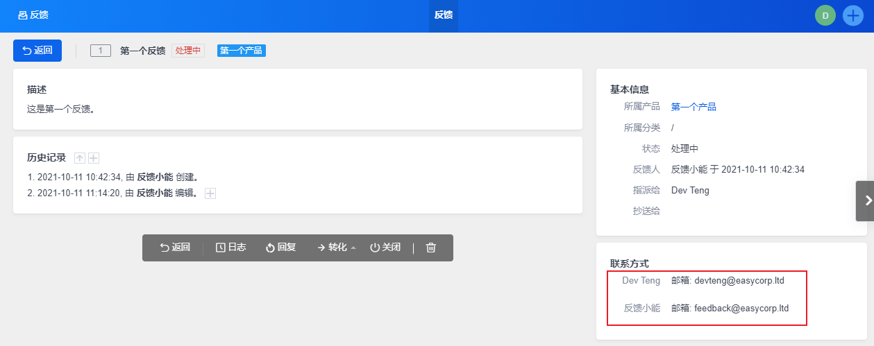 在反馈详情页面,可以查看到转为任务后的信息。