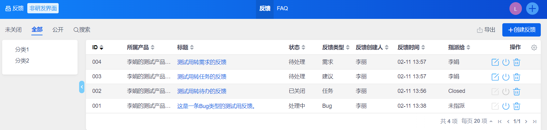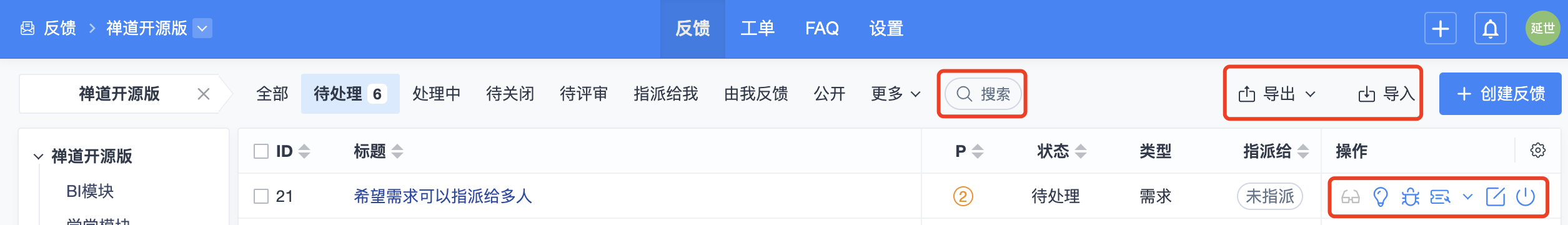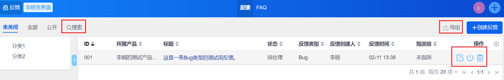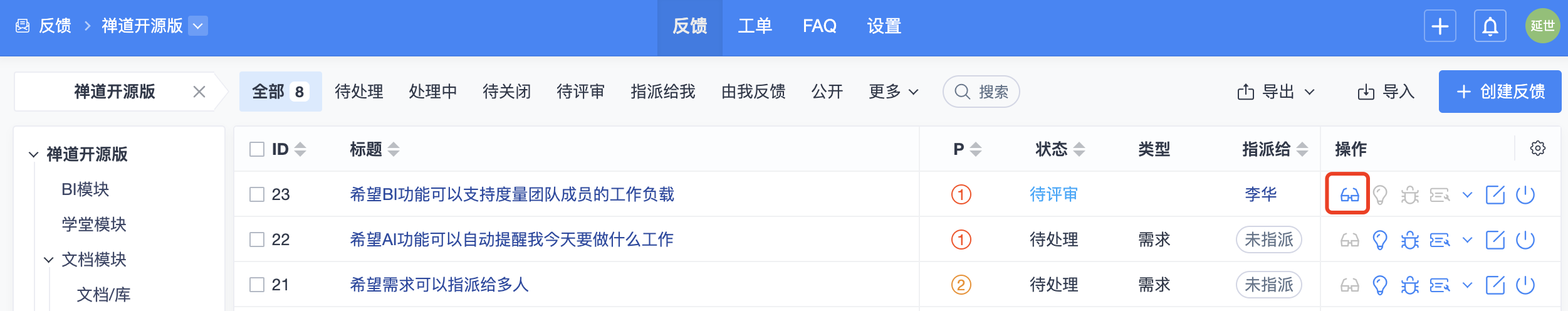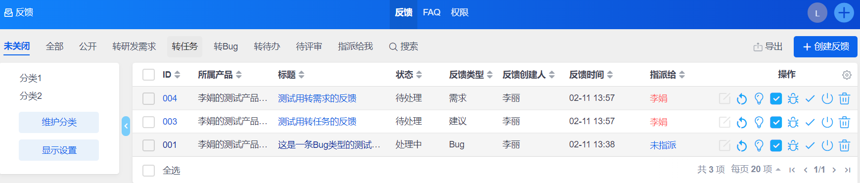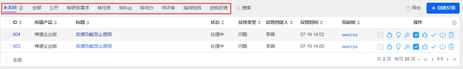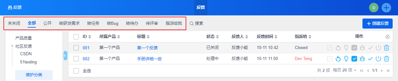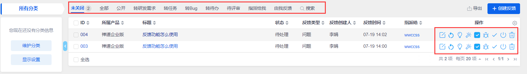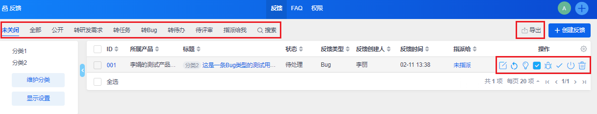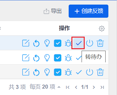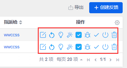 可以通过反馈列表的右侧操作栏的操作按钮对反馈执行相关操作。